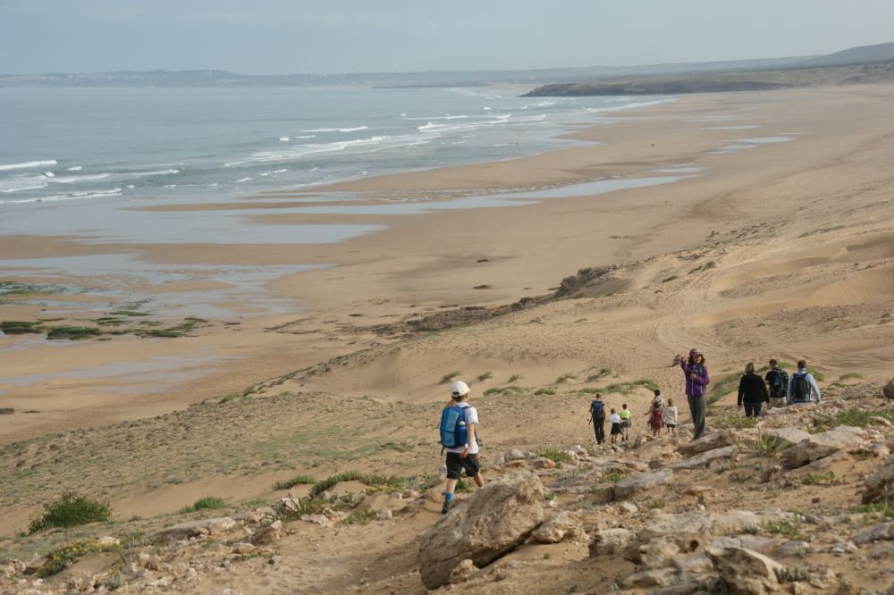 Aujourd’hui, nous partons explorer le nord de Sidi Kaouki. Nous débutons la marche sur les plages et sous les eucalyptus et nous longeons la côte jusqu’au Cap Sim où nous pouvons admirer la vue au Nord et au Sud sur les plages et les falaises sauvages.