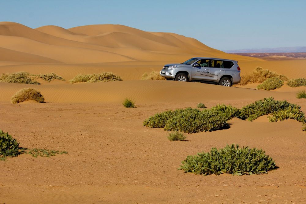 After breakfast, drive to the golden dunes of Chegaga, visit the souk of Zagora dates, then pass to discover the workshops of the green pottery and Koranic school of Tamegroute before taking the desert road of sand and stone and to reach Chegaga. Installation in a luxury bivouac, walk, sunset, dinner and singing. Night in a tent in a luxury bivouac.