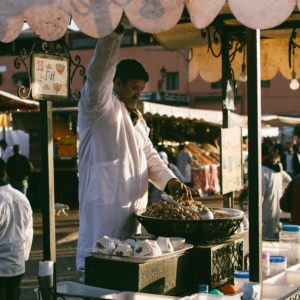 Au gré de la déambulation, dégustation d’olives de ci et là, de fruits secs, un bol de Harira, cette soupe traditionnelle surtout consommée pendant le mois sacré de Ramadan, des pâtisseries au miel, aux amandes… Selon les préférences de chacun, dégustation de brochettes de foie au barbecue, d’escargots cuits que l’on consomme de manière ambulante, de briouates au poisson ou au poulet (sucrée/salée, poulet & amandes grillées) …