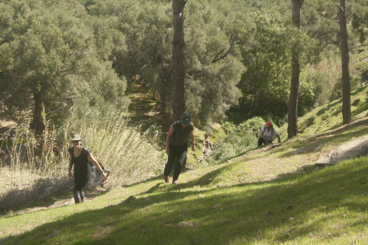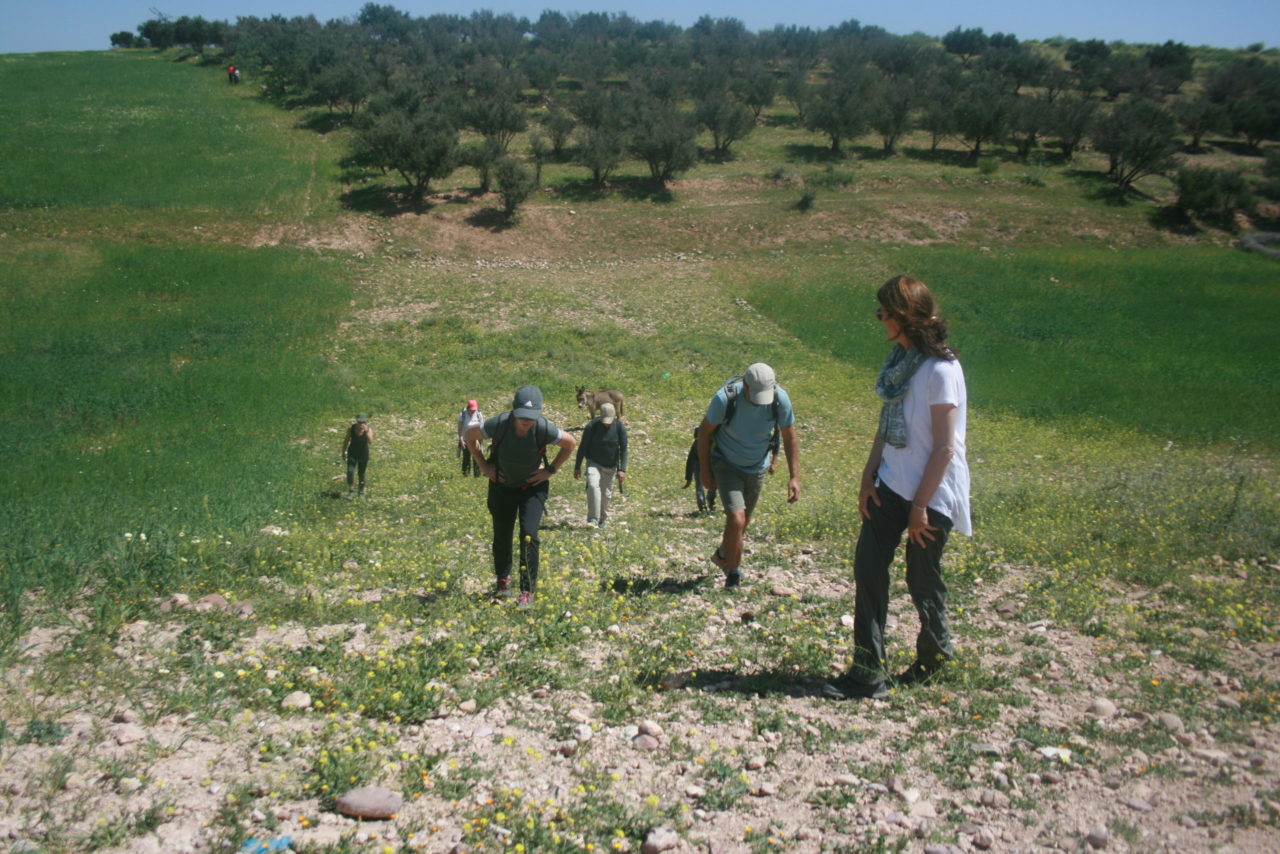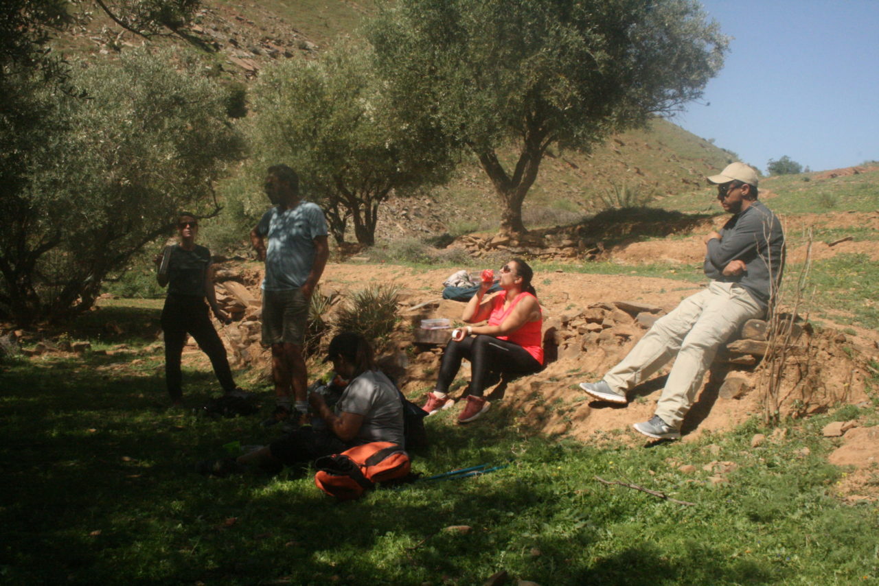 Pause à mi parcours avec fruits secs, biscuits …pour patienter jusqu’au déjeuner tardif cuisiné par une famille, à déguster dans une parcelle au milieu des oliviers. L’agence est très impliquée auprès de cette famille, celle de Fatima, responsable d’une coopérative féminine (production de graines de couscous aux herbes).